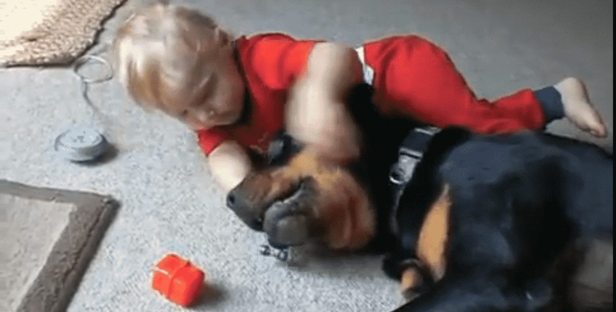 Giant Rottweiler Gently Tosses Around Toys To Baby